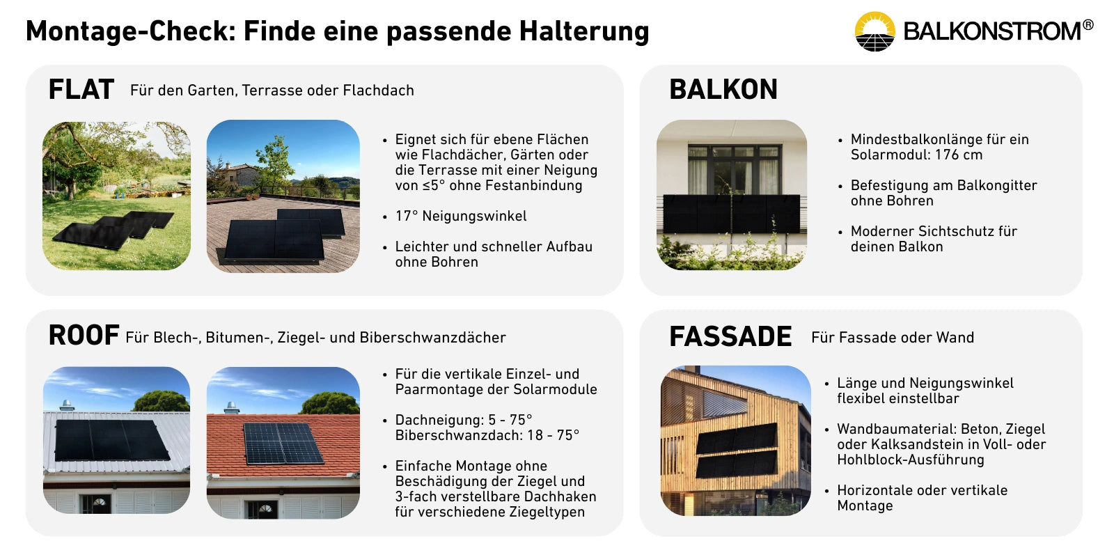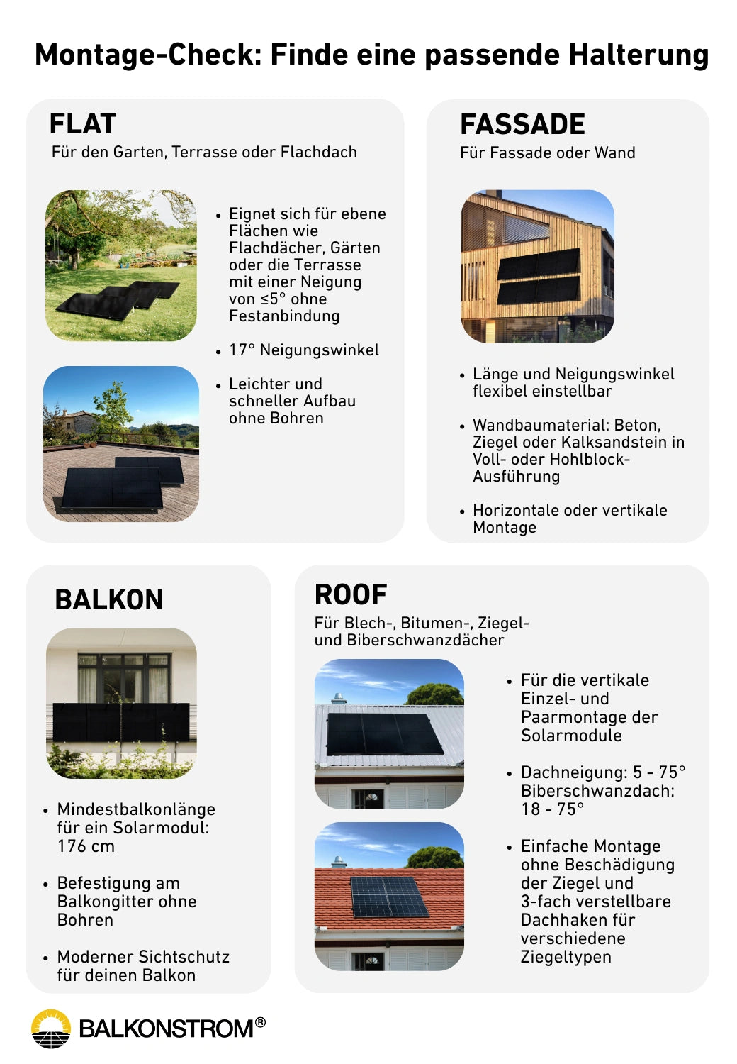 Hohe Erträge kannst du bei einer Ausrichtung nach Süden, Osten und Westen erzielen. Der Neigungswinkel ist bei jeder unserer Halterung über 15 Grad. Dies ist wichtig, damit der sogenannte Selbstreinigungseffekt eintritt und starke Verunreinigungen wie Vogelkot durch Regen gereinigt werden kann.
